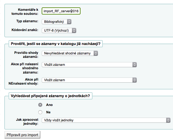 Vyplníte komentář k souboru (aby bylo později případně možné jej zpětně identifikovat) a dále zvolíte postup, jak má Koha zpracovat záznamy ve vztahu k již existujícím záznamům. Výše uvedené hodnoty jsou doporučené, ale můžete chování přizpůsobit vašemu systému. Dále klikněte na "Připravit pro import".